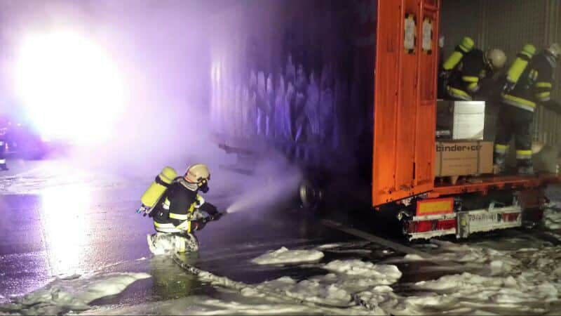 Bei unserem Eintreffen stand der Anhänger des LKW’sin Brand, der Fahrer hatte zum Glück richtig reagiert und den brennenden Hänger abgehängt.