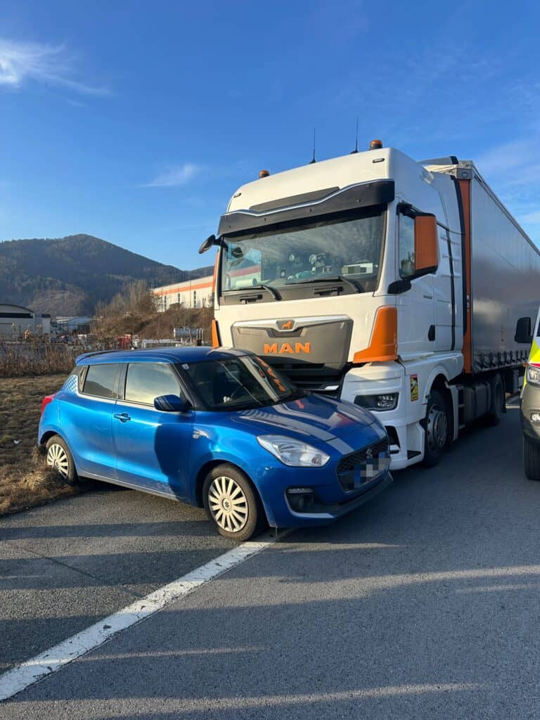 Nach dem Knoten Deutschfeistritz in Fahrtrichtung Süden kollidierten ein PKW und ein LKW miteinander. Die Fahrerin des PKW wurde dabei unbestimmten Grades verletzt und vom bereits anwesenden Roten Kreuz versorgt.