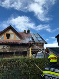 Beim Eintreffen am Einsatzort zeigte sich ein ausgedehnter Fassadenbrand mit Flammenübergriff auf den Dachstuhl. Unsere Aufgaben umfassten das Verlegen einer Zubringleitung zur Wasserversorgung sowie die Stellung eines Atemschutztrupps, der aktiv bei den Löscharbeiten unterstützte.