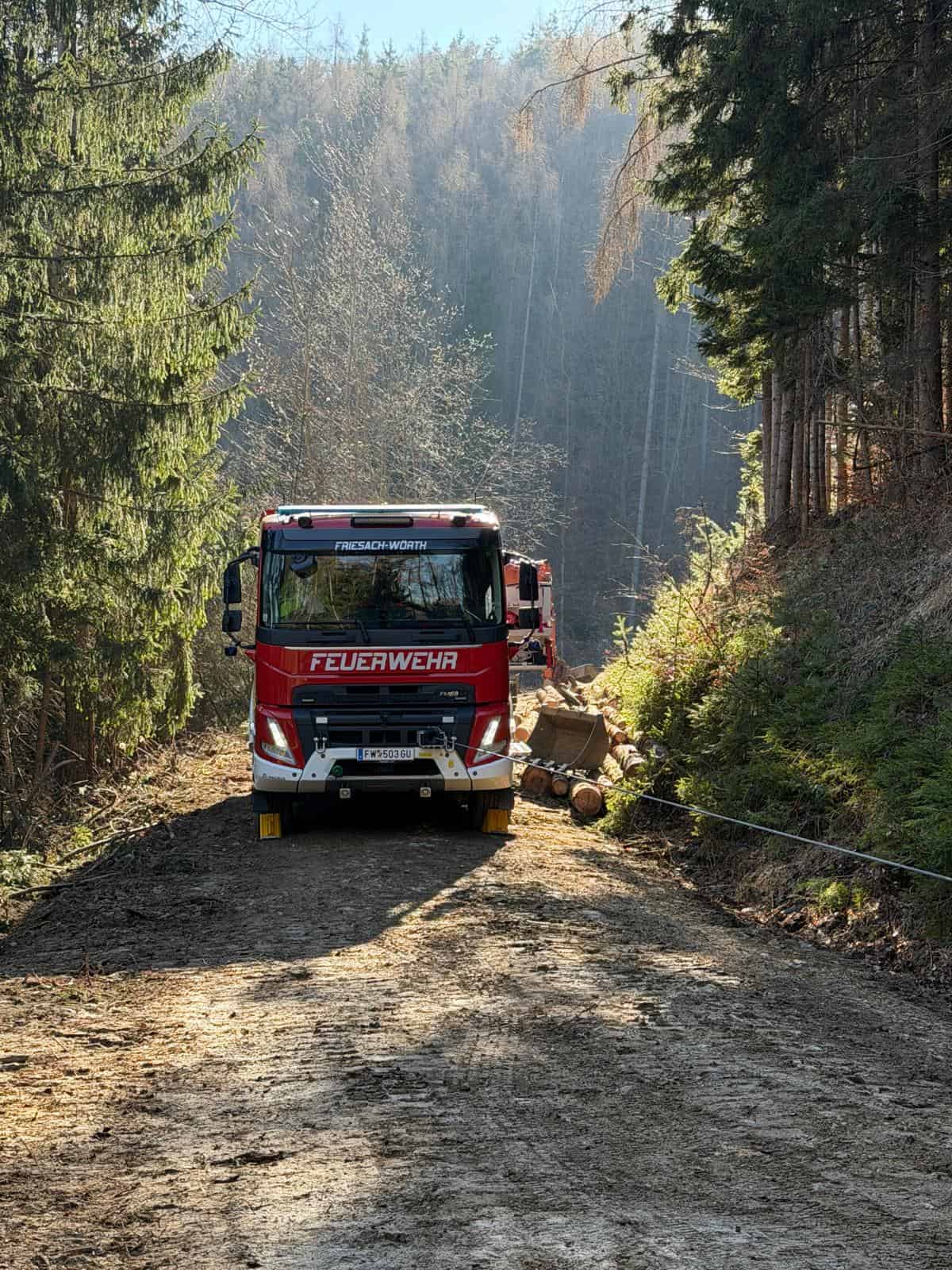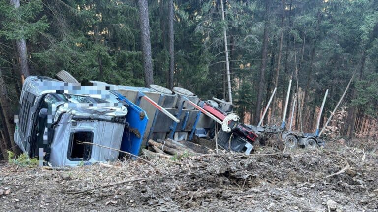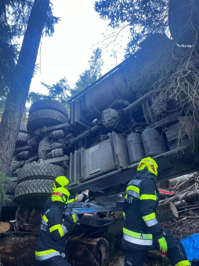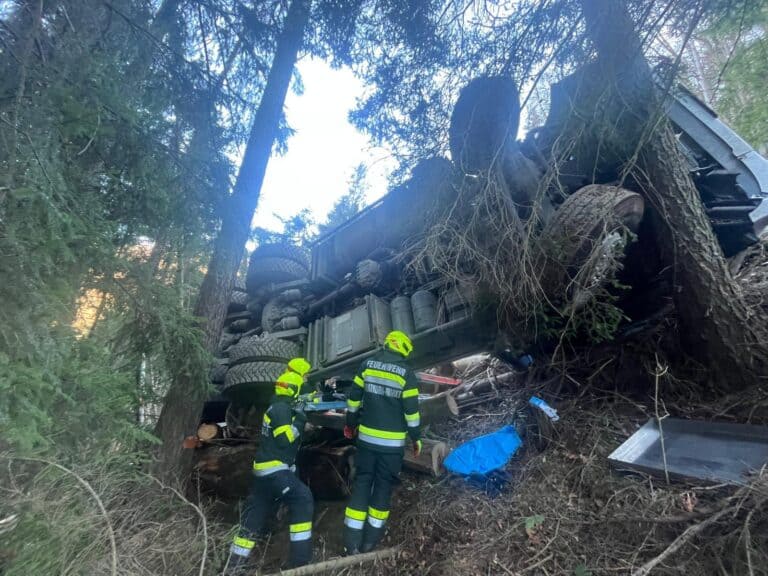 Am Freitag, dem 27. Februar 2026, wurden wir um 13:32 Uhr gemeinsam mit der FF Gratkorn‑Markt zu einem Verkehrsunfall mit einem LKW am Eggenberg alarmiert. Ein Holztransporter samt Anhänger war vom Forstweg abgekommen, hatte sich überschlagen und kam erst im Wald zum Stillstand. Der Fahrer wurde dabei unbestimmten Grades verletzt und vom Roten Kreuz medizinisch versorgt.