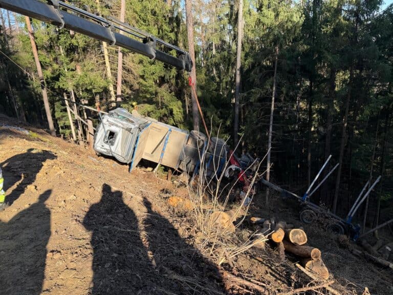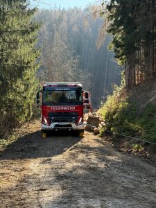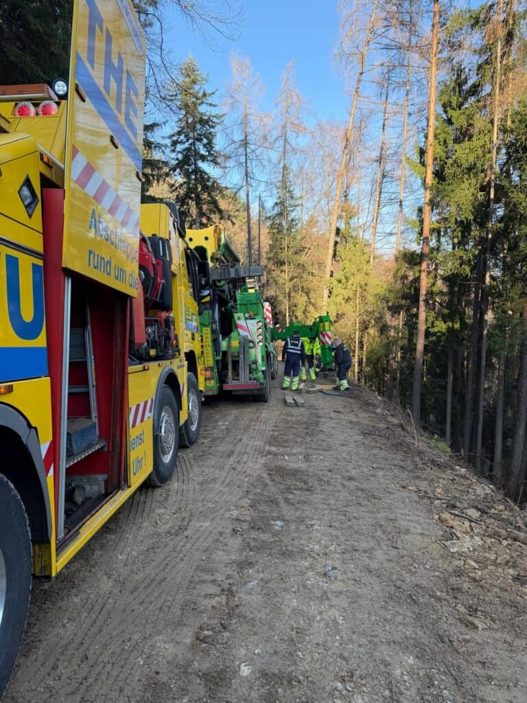 Am Samstag rückten wir um 8:00 Uhr erneut zum Einsatzort aus. Mit Unterstützung der Firma des verunfallten LKW sowie der Firma Wuthe gelang es nach mehreren arbeitsintensiven Stunden, das Fahrzeug zu bergen. Anschließend entfernten wir sämtliche im Wald verstreuten Fahrzeugteile und führten umfangreiche Reinigungsarbeiten durch.