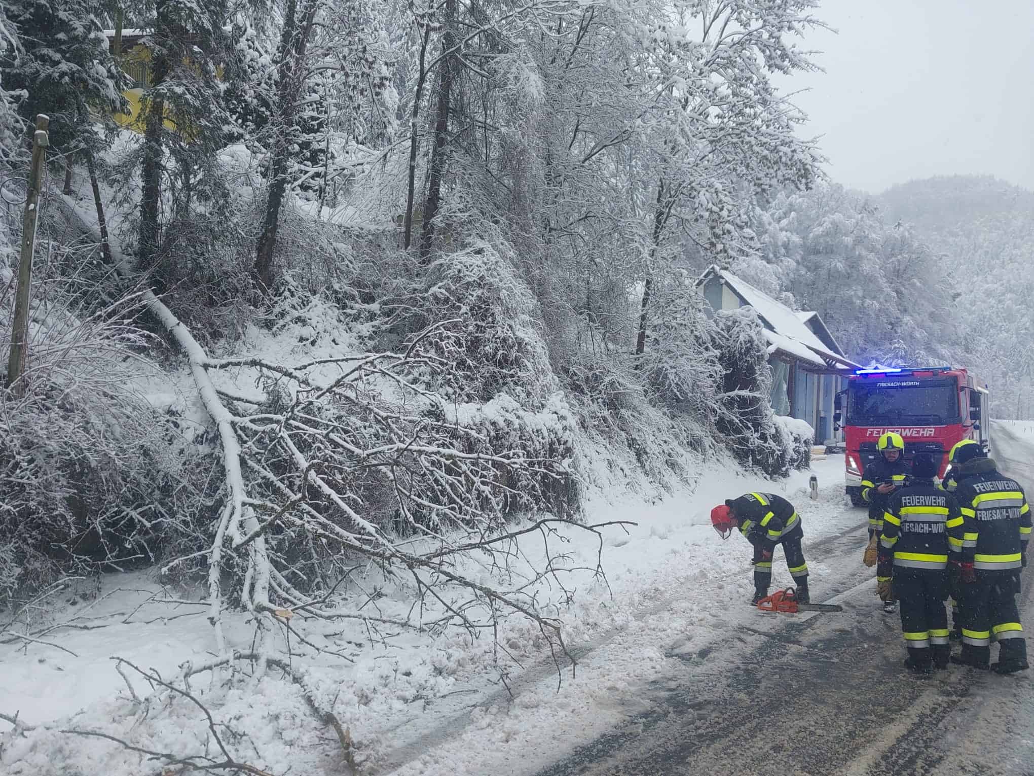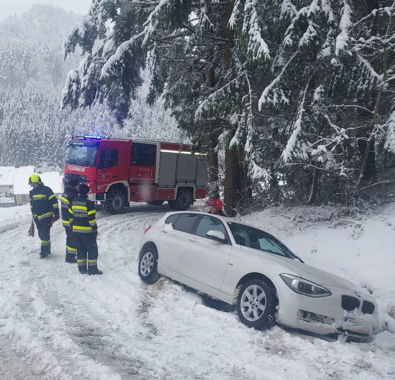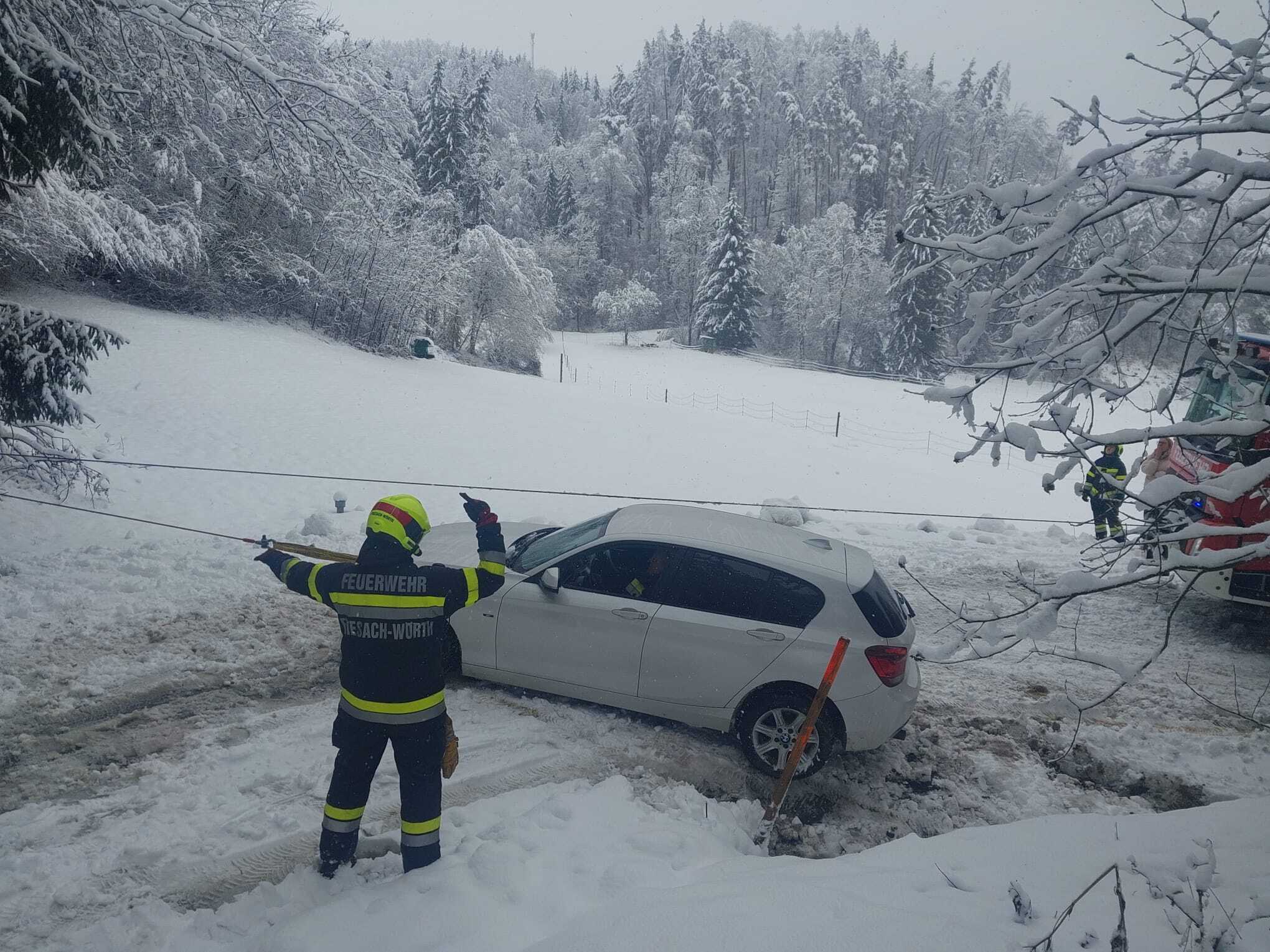 Neben der Beseitigung zahlreicher Bäume mussten auch mehrere Fahrzeugbergungen durchgeführt werden. Einige Autos waren aufgrund der massiven Schneemengen und herabgestürzten Baumteile stecken geblieben oder konnten ihre Position nicht mehr aus eigener Kraft verlassen. In sorgfältiger Abstimmung wurden diese Fahrzeuge gesichert, freigeschnitten und anschließend aus den Gefahrenbereichen geborgen.